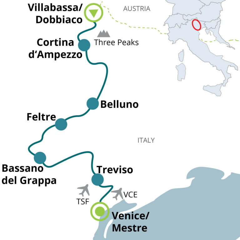 O roteiro das Dolomitas a Veneza passa por uma das regiões mais lindas da Itália, durante o percurso você passará pelo vale Höhlensteintal, abaixo dos Três Picos (Drei Zinnen) chegando na cidade de Cortina d’Ampezzo, uma cidade muito conhecida por suas estações de esqui. O caminho segue passando pela antiga linha férrea da Ferrovia Dolomita até Pieve di Cadore, cidade onde nasceu o pintor Ticiano, e depois continua pelo vale dos fabricantes de sorvete até a cidade de Belluno. A rota Dolomitas a Veneza continua passando pelas cidades de Feltre e Bassano del Grappa, chegando a uma planície e passando em Asolo, conhecida como a cidade dos cem horizontes e então terminando o dia em Treviso, chamada de cidade da moda. De Treviso até Veneza, nosso destino final, o passeio passará pelo Rio Sile e por lindas paisagens.