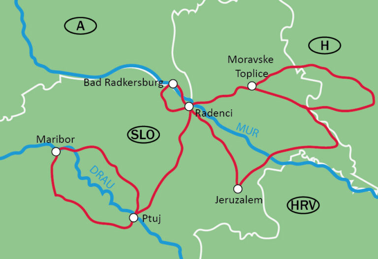 No começo do tour, o percurso oferece vistas panorâmicas e paisagens dignas de cartão-postal. Pequenas capelas, adegas e fazendas bem cuidadas ladeiam o caminho até a fronteira com a Croácia. Você mergulhará na paisagem verdejante e tranquila da região de Medjmurje, no norte da Croácia. Estradas de vinho serpenteiam pelo campo e tabernas de vinho (kleti) convidam a pequenas pausas e degustações. Seguindo para o norte, você retorna à Eslovênia e desce para a região de Prekmurje, onde a paisagem muda significativamente: torna-se mais aberta, ampla e tranquila. O contraste com as rotas de vinho montanhosas é claramente perceptível. Na ciclovia plana e bem estruturada, você pedala confortavelmente até Moravske Toplice. A cidade é conhecida por sua fonte de água mineral termal negra e por seu moderno spa, o Terme 3000. Perfeito para relaxar após a etapa transfronteiriça.