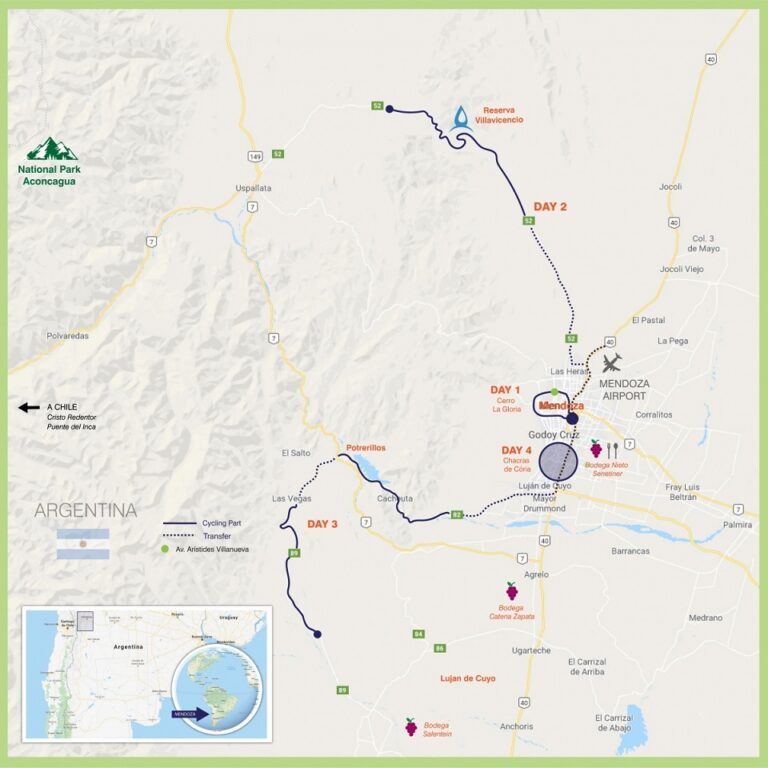 O roteiro Mendoza – Bike & Vinho foi criado para aqueles que, além de pedalar, apreciam um bom vinho. Com a sua identidade inconfundível associada ao vinho, Mendoza é a principal província produtora e, portanto, a que conta com a maior concentração de adegas e vinhedos. As paisagens das vinícolas, cordilheiras e da região de Mendoza junto a gastronomia e vinhos fazem deste roteiro um imperdível! Acomodação em Hotéis e meia pensão. Teremos disponível um guia local turístico 24 horas durante toda sua estadia.